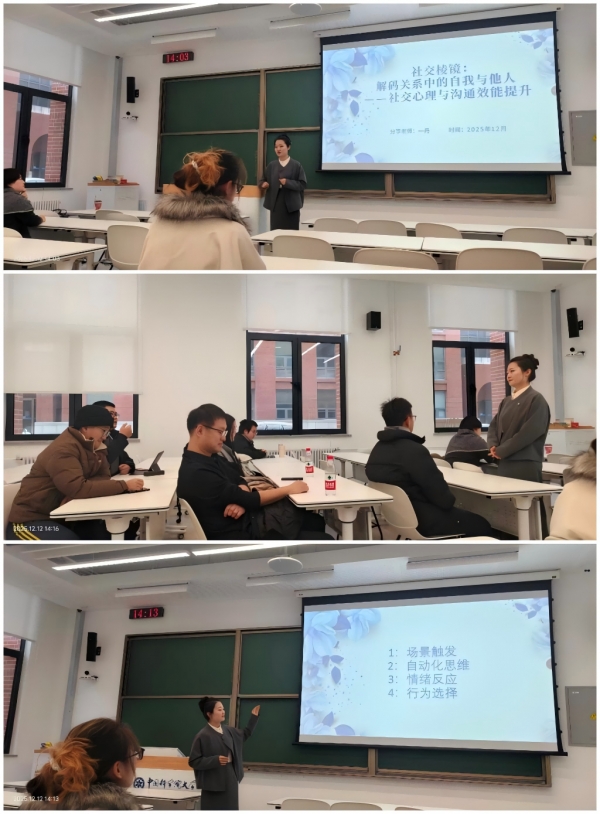 为帮助研究生提升社交心理认知与沟通效能,2025年12月12日14:00,中国科学院大学雁栖湖校区教3-119教室举办了主题为“社交棱镜:解码关系中的自我与他人——社交心理与沟通效能提升”的讲座。本次活动由国科大材料光电未来技术学院党委、笃行致远辅导员工作室主办,特邀国际注册心理咨询师、湖南工业大学交通与电气工程学院客座教授史一丹教授主讲,吸引了众多研究生参与。